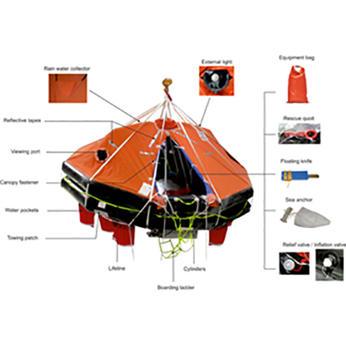 The davit launched liferaft is an inflatable type liferaft installed on vessels and platforms and launched using davits mounted on the deck. The crew can board the davit launch Liferaft from the deck and then lower it down to water. In case of any davit malfunction, the davit launch Liferaft can be activated like the throw overboard rafts. It is widely used in passenger ships and cargo vessels. It is equipped with a free fall device for lowering. The typical height of installation is 18 – 35 m. Capacities range from 15 – 25 persons.